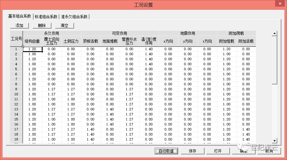 荷载组合以表格的形式进行,可以增、删、改、存,非常方便。