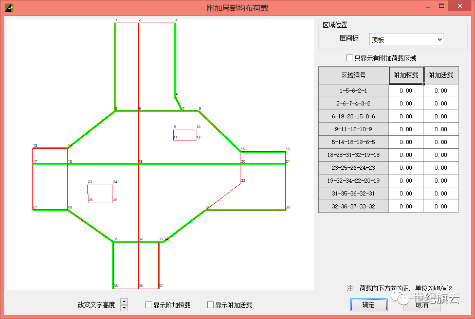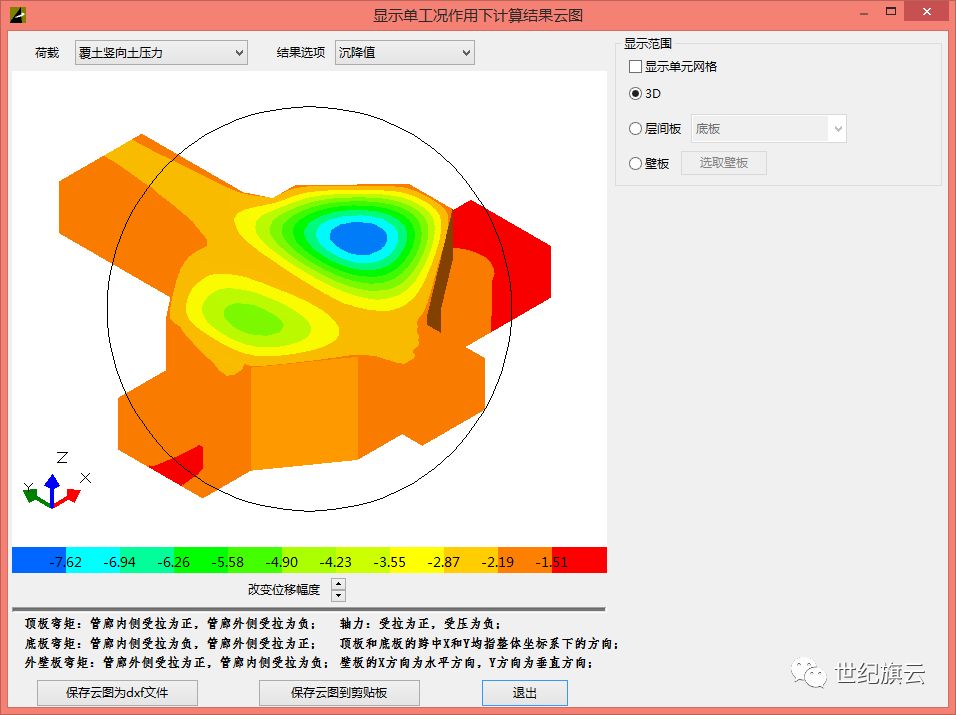 程序采用有限元方法进行内力分析,自动进行网格剖分(均采用四边形壳单元)、内力计算可靠,用户可以查看弯矩云图、轴力云图、变形云图,查看任意点的内力值和位移值。